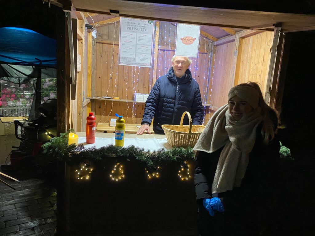 Es werden selbstgebackene Waisenstift-Kekse, Waffeln, Würstchen, Glühwein und Punsch angeboten.